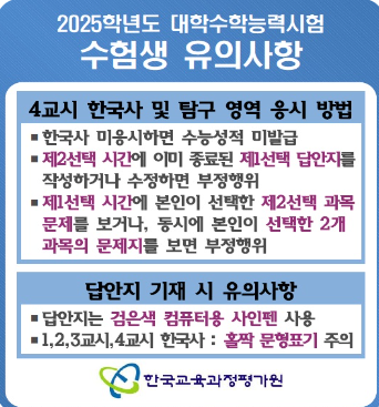 - 필수 준비물: 수험표, 신분증, 검정색 컴퓨터용 사인펜, 샤프와 샤프심(교육청에서 배부하는 경우만 허용)